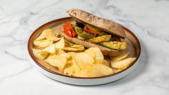 With colorful peppers, zucchini, eggplant, & lemon olive oil dressing