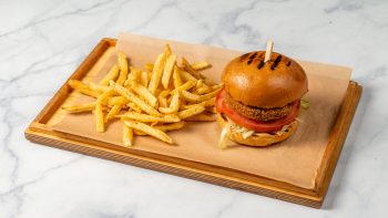 Με μπιφτέκι λαχανικών, καραμελωμένο κρεμμύδι, ντομάτα, iceberg & BBQ sauce. Συνοδεύεται πατάτες τηγανητές