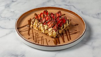 Με απαλή κρέμα βανίλιας, φρέσκες φράουλες & κουβερτούρα γάλακτος πάνω σε τραγανά φύλλα ζύμης