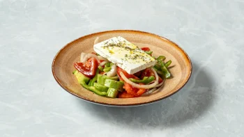 Σαλάτα με ντομάτα, αγγούρι, φέτα, κρεμμύδι, πιπεριές, ρίγανη & ελαιόλαδο. Συνοδεύεται πιτάκια