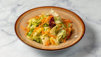 Σαλάτα με μαρούλι, Iceberg, λόλα πράσινη, λόλα κόκκινη, καρότο, ρόκα & dressing vinaigrette. Συνοδεύεται πιτάκια