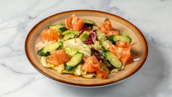 Σαλάτα με μαρούλι, avocado, αγγούρι, iceberg, λόλα κόκκινη, λόλα πράσινη, σολομό καπνιστό & dressing με άνηθο. Συνοδεύεται πιτάκια