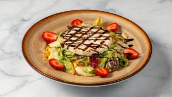 1500ml. Σαλάτα με μαρούλι, Iceberg, λόλα πράσινη, λόλα κόκκινη, ρόδι, φράουλα, σύκο, μανούρι, κρουτόμ & dressing βαλσάμικο. Συνοδεύεται πιτάκια