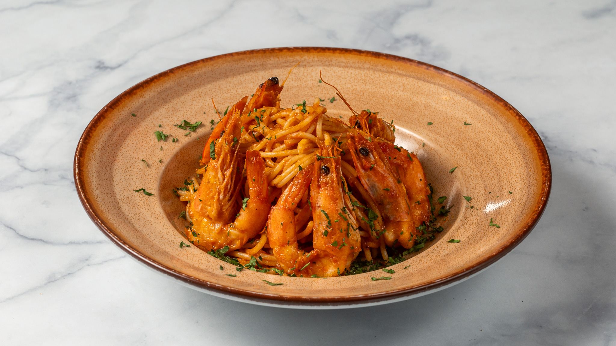 Με καθαρισμένες γαρίδες σβησμένες με ούζο, ψιλοκομμένο κρεμμύδι σωτέ, πολύχρωμες πιπεριές & σάλτσα Napoli