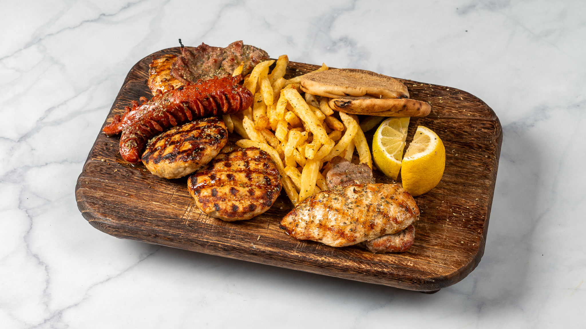 Με μπιφτέκι μοσχαρίσιο, μπιφτέκι γαλοπούλας, ψαρονέφρι, φιλέτο κοτόπουλο & λουκάνικο χωριάτικο. Συνοδεύεται φρέσκες τηγανητές πατάτες & πιτούλες