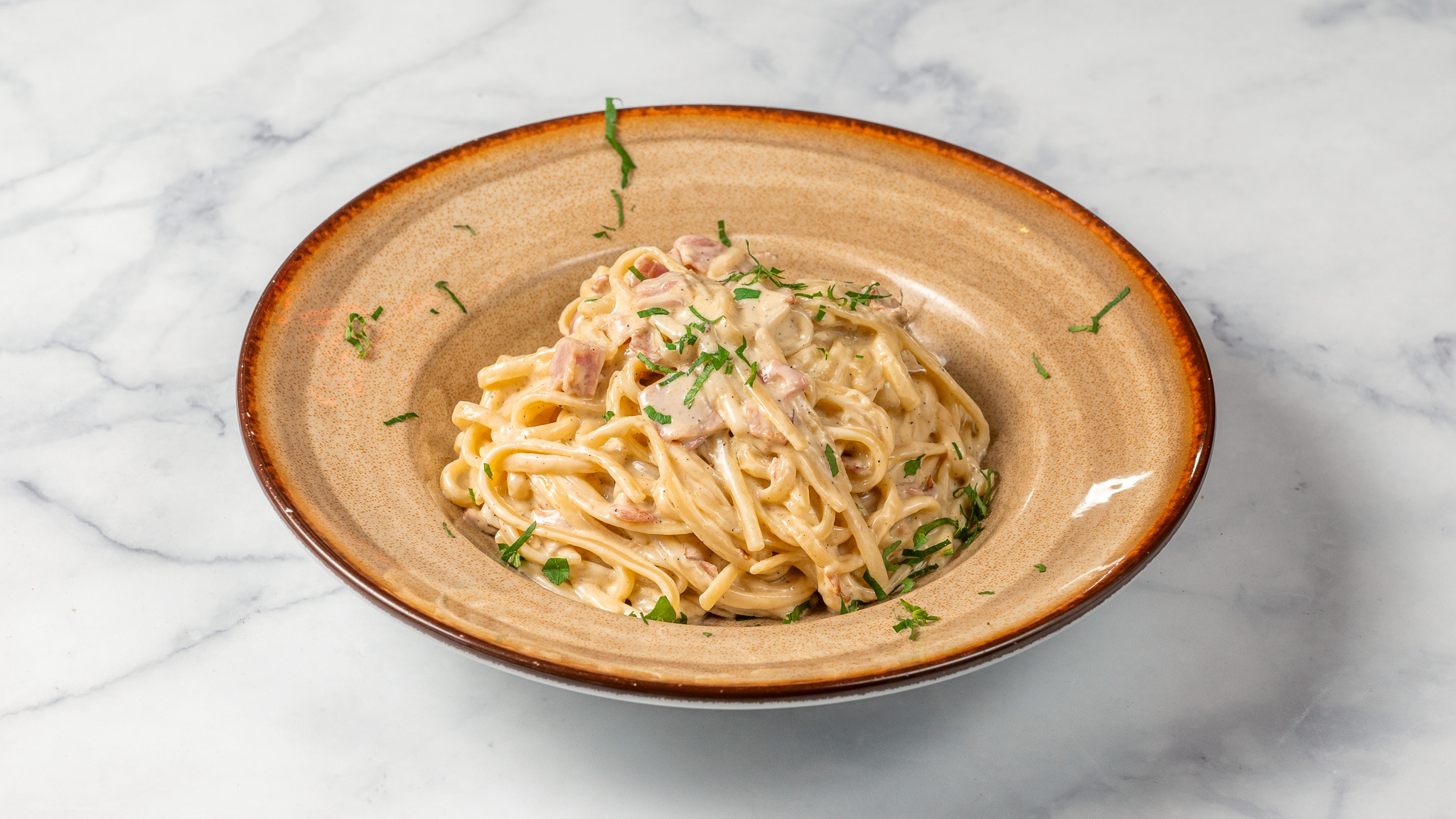 Με τραγανό καπνιστό χοιρινό, κρέμα παρμεζάνας & αυγό