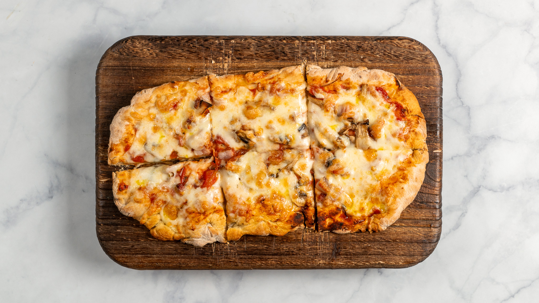 Με σάλτσα ντομάτας San Marzano, mozzarella, gorgonzola & πανσέτα καπνιστή