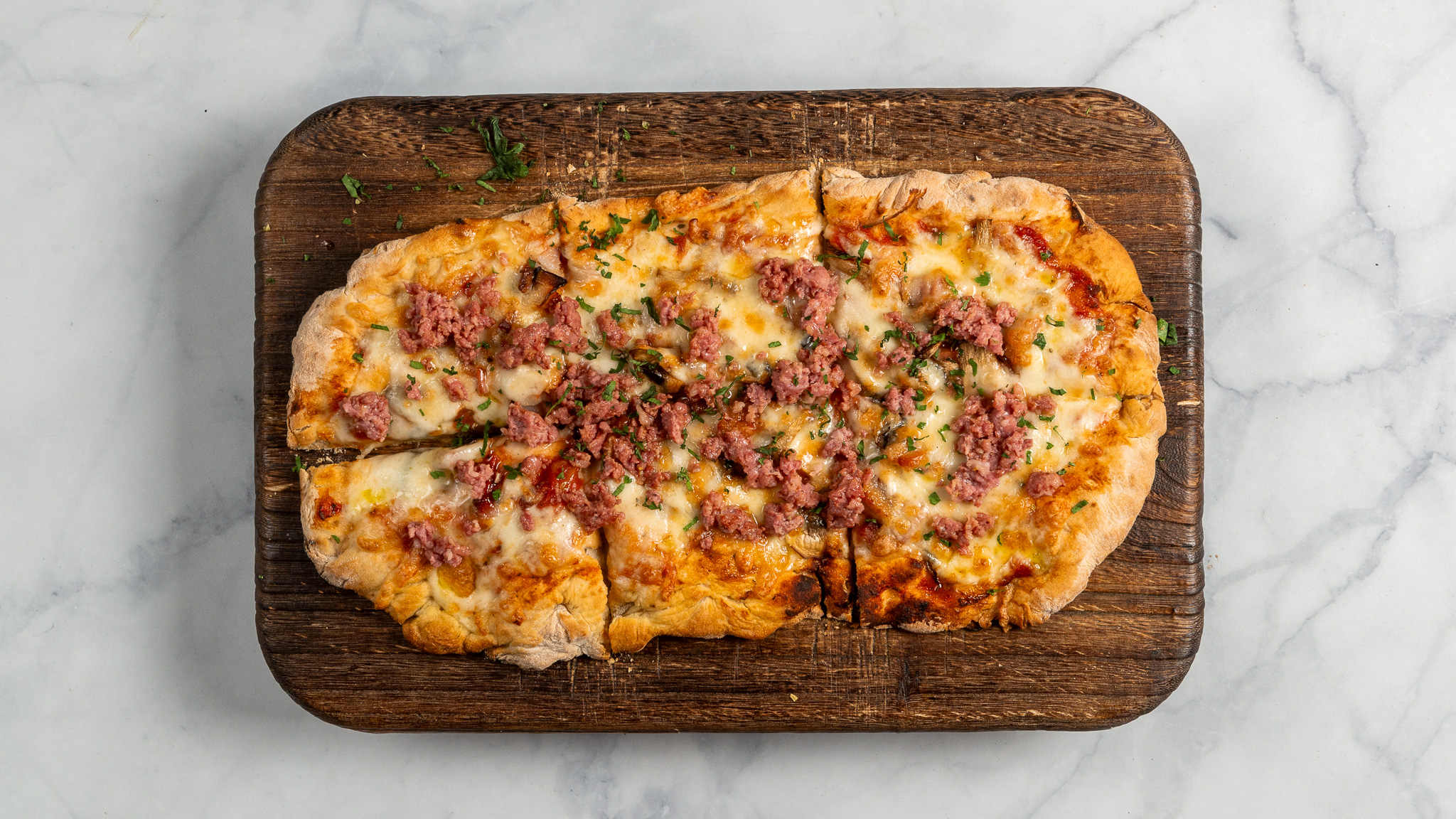 Με σάλτσα ντομάτας San Marzano, mozzarella, λουκάνικο ιταλικό salsiccia & μανιτάρια